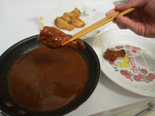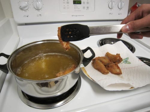 Add the wings in batches and cook until golden brown and cooked through, 8 to 10 minutes. Removed with a slotted spoon and place on a plate lined with paper towels.