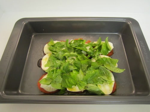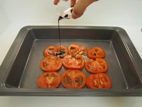 Arrange the tomato slices on the bottom of the baking sheet in a single layer. Drizzle with the balsamic vinegar.