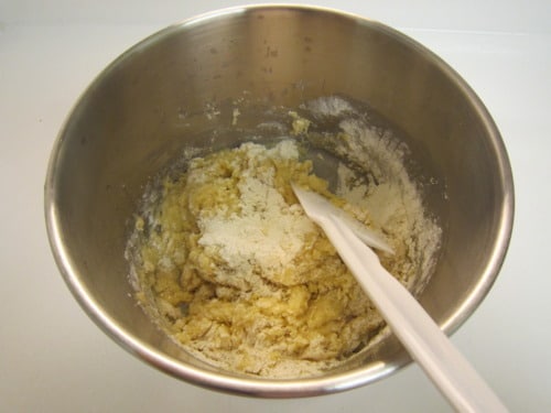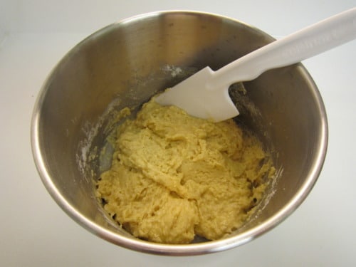 Using a rubber spatula, fold dry ingredients into egg mixture.