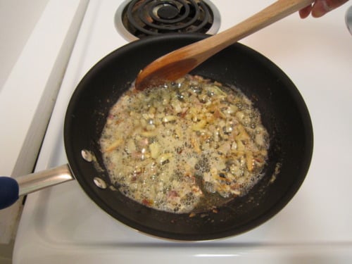 Meanwhile, in a large skillet, melt 1 tablespoon butter in 1 tablespoon olive oil over medium-high heat. Saute the shallots, garlic, and red pepper flakes until the shallots are translucent, about 3-4 minutes.