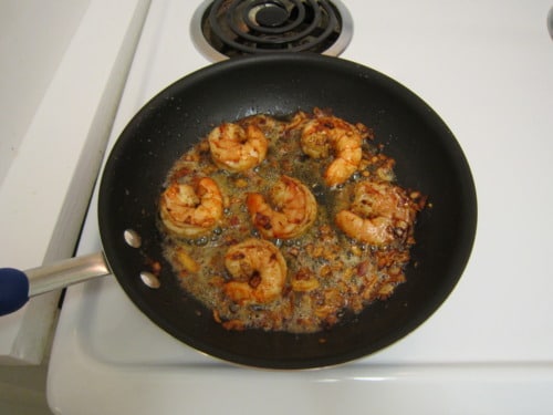 Season the shrimp with salt and pepper; add them to the pan and cook until they have turned pink, about 2-3 minutes. Remove the shrimp from the pan; set aside and keep warm.