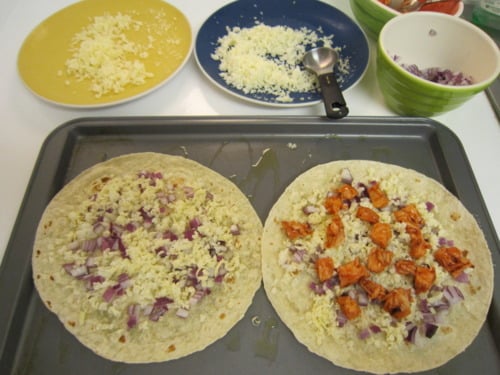 Top with the remaining 4 tortillas. Brush the top of the tortillas with oil and sprinkle with the chili powder. Place tortillas on a lightly oiled baking sheet and bake for 5-7 minutes or until golden brown and cheese has melted.
