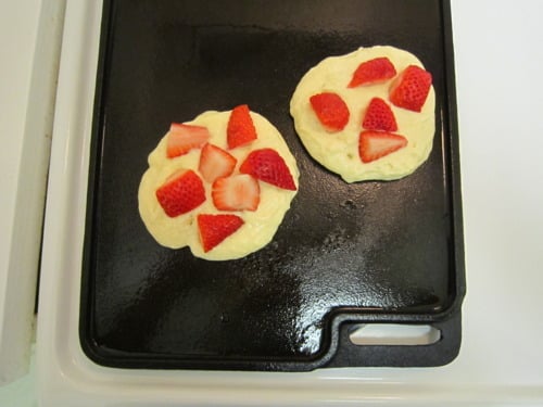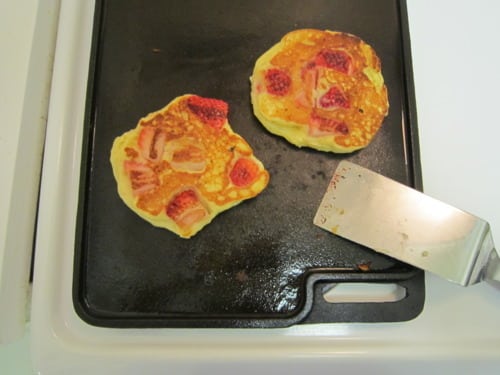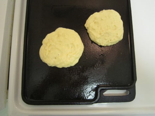 Heat a large seasoned cast iron skillet, frying pan, or griddle over medium heat. To check that the pan’s properly heated, sprinkle a few drops of water on pan or griddle and water will “dance” around before evaporating. (I’ve used both the frying pan and the griddle when making pancakes and the griddle always made the pancakes taste a little bit better.)