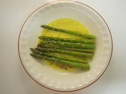 Once asparagus has finished, serve immediately with a side of the soy garlic aioli.