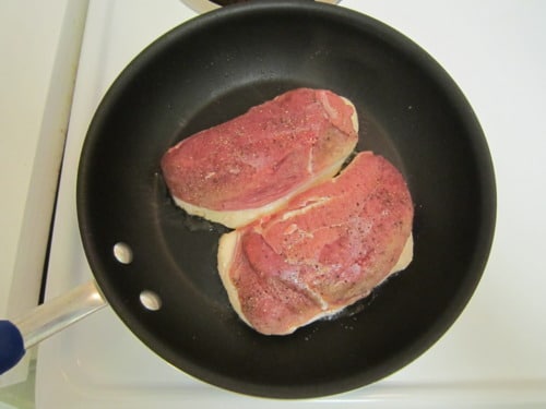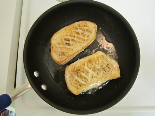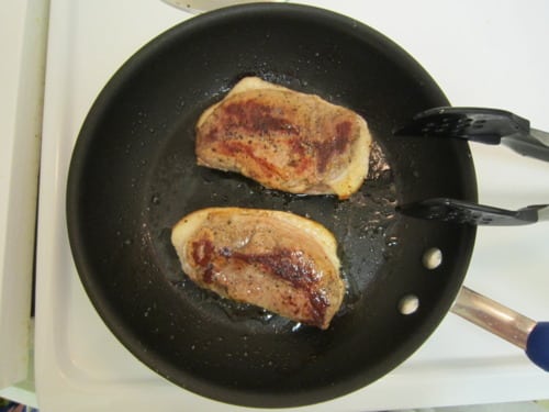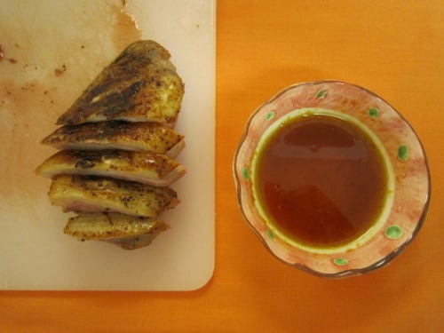 Drain the fat and continue cooking meat until skin is crisp and browned. Each side takes about 5 minutes or more. (It depends on how thoroughly you want your meat cooked. I always like it a bit pink.)