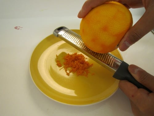 Zest orange and add it to a small pot of boiling water for 2 minutes. This is to remove any bitterness from the orange.