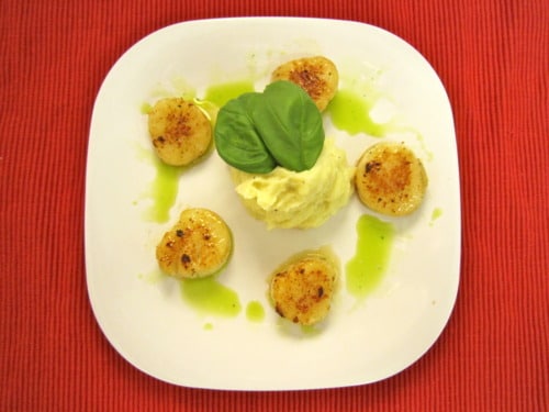 Pan-Seared Scallops with Yukon Gold Potato Mash and Basil Oil