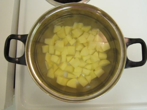 Place potatoes in a 1-quart saucepan and cover with water. Bring the water to a boil and cook the potatoes until tender, about 15 minutes.