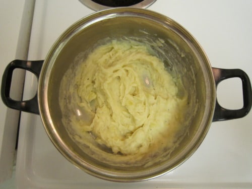 Drain the potatoes and return them to the saucepan. Add the cream, 2 tablespoons of the butter, and salt and pepper to taste.