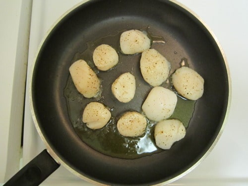 Heat a 10-inch saute pan over medium-high heat. Season the scallops with salt and pepper, to taste. Add the olive oil to the pan and place scallops in pan.
