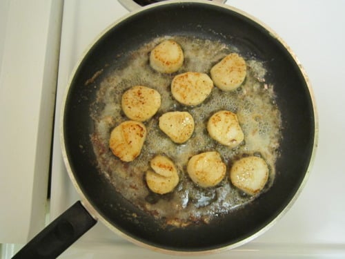 Sear for 1 minute on the first side, then add the remaining 1 1/2 tablespoons of butter to the pan. Continue to cook for about 30 more seconds and then turn over. Cook the scallops for 30 seconds on the second side and remove from the heat.