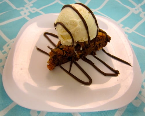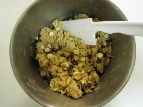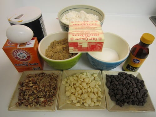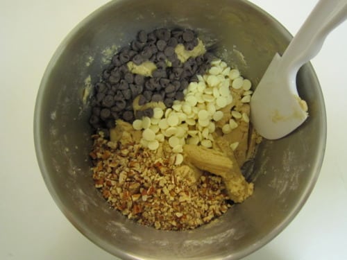 - 1 1/2 cups mixed chocolate chips (I did 1/2 cup white chocolate chips, 1/2 cup semisweet chocolate chips, and 1/2 cup chopped pecans. Next time, I plan on trying a mixture with some butterscotch chips.)