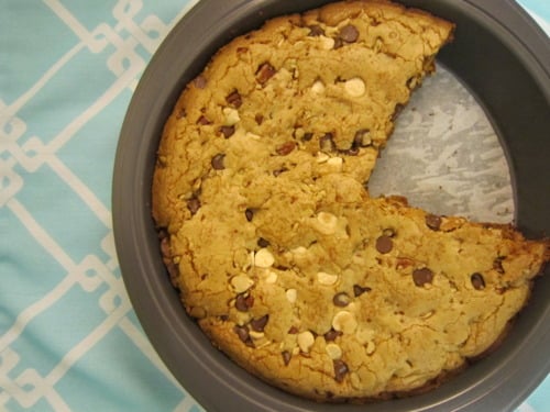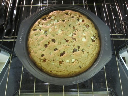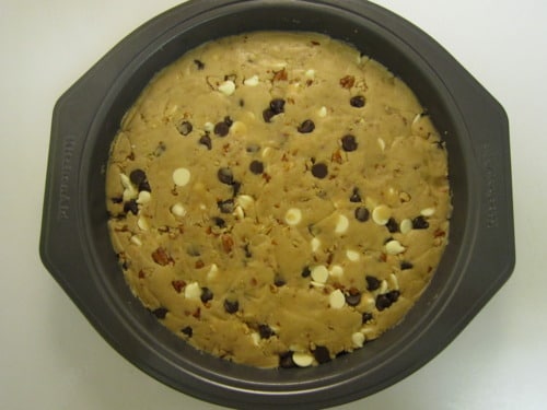 What’s great about making a homemade cookie cake is how much you could adapt it to your exact liking. You can add in any kind of baking pieces (chocolate chips, butterscotch chips, peanut butter chips, toffee bits, etc.) and you can top it off with any flavor of ice cream and dessert sauce. The possibilities are endless! But tonight, I kept it somewhat simple with a chocolate and white chocolate chip cookie cake with pecans topped with vanilla ice cream, drizzled with Nutella.