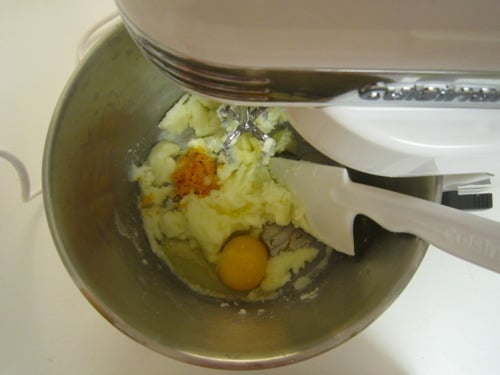 Add whole egg and orange zest, scraping down sides of bowl as necessary.