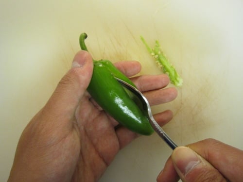 Pry open enough to hold back long cuts (to expose ribs and seeds), then devein and seed using tip of a paring knife and kitchen shears; set aside. (A small spoon worked fine for me.)