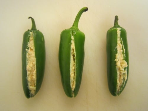 Spread 1 tablespoon of the cheese mixture into each jalapeno.