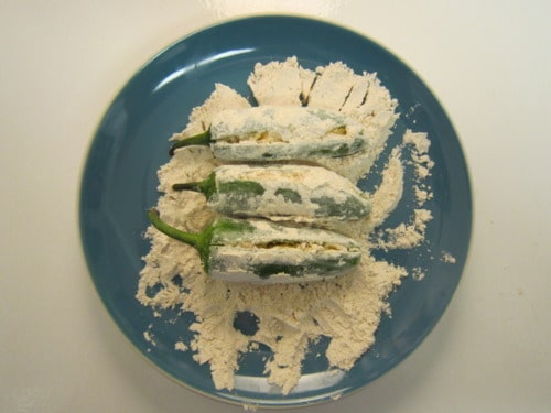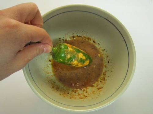 Cut a lengthwise slit from stem to bottom of each chili. Make a cross wise incision at stem end, forming a T.
