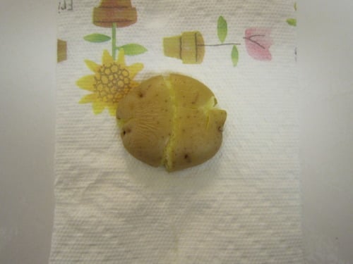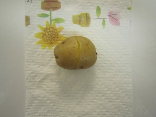 Place them, one at a time, on a paper towel. Fold the paper towel over the potato and carefully smash the potato with the palm of your hand so that it is flattened but still in one piece; repeat with remaining potatoes.