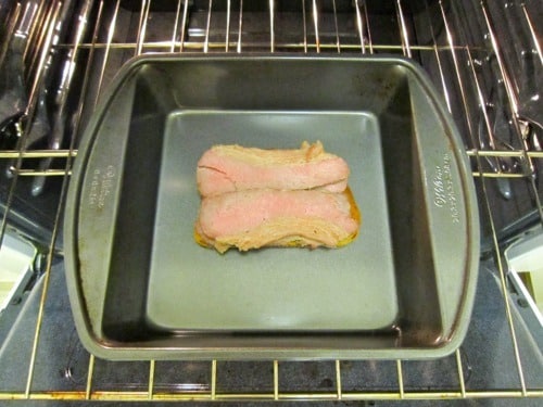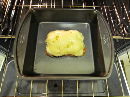 Remove from oven and top with sauerkraut and a few slices of Swiss cheese. Bake until cheese melts.
