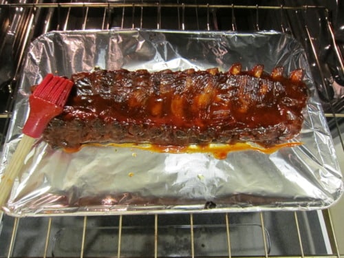 Increase oven temperature to 350 degrees F. Remove aluminum foil and baste ribs with barbecue sauce.