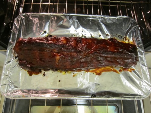 Cover baking dish with aluminum foil and cook ribs for 2 hours. (Don’t forget to rotate pan.)