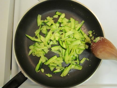 Heat 1 tablespoon of oil in a large non-stick skillet over medium heat. Add 1 clove of garlic and cook for 30 seconds. Add zucchini ribbons and cook until tender, stirring occasionally, about 6 minutes. Transfer zucchini to a bowl.