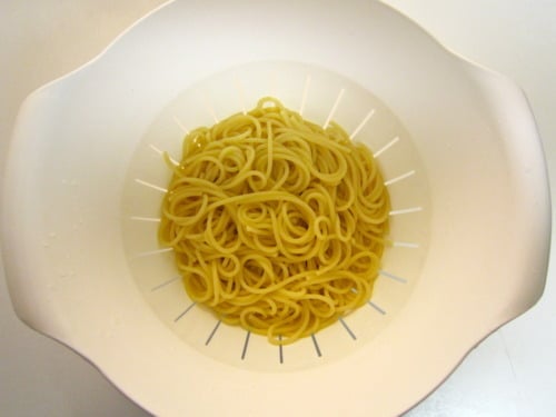 Cook the pasta al dente according to the directions on the package. Ladle out a half cup of pasta water and set aside; drain pasta.