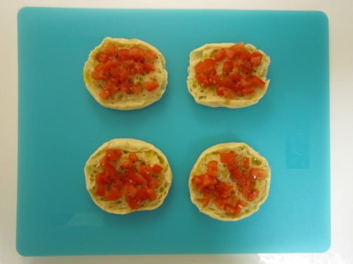 Place the English muffin halves cut-side up and top each with tomato, drizzle with olive oil, and season with freshly ground black pepper, to taste.