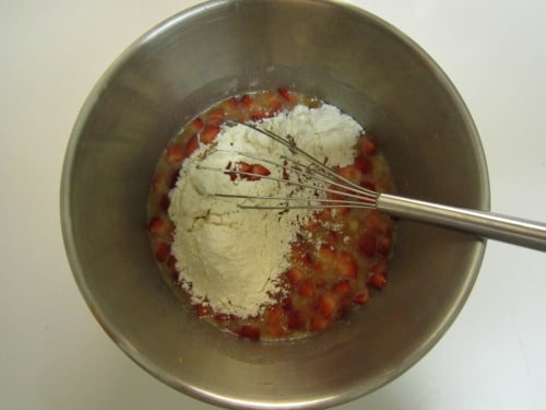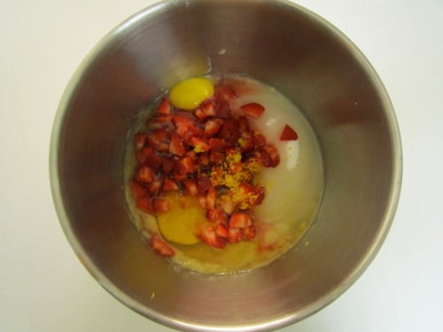 In a large bowl, whisk together the mashed banana, eggs, oil, 1 cup sugar, strawberries, and lemon zest.