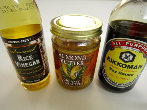 To make the sauce, whisk together the almond butter and water until smooth. Then, whisk in the rice vinegar and soy sauce.