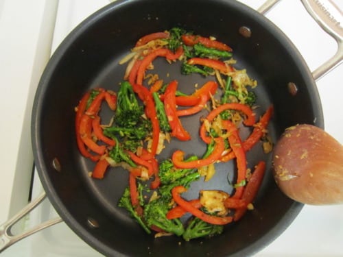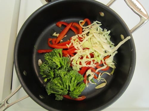While the noodles are cooking, heat the olive oil over medium-high heat in a large saute pan or wok. Add the cabbage, red pepper and broccoli and saute for 5 minutes.