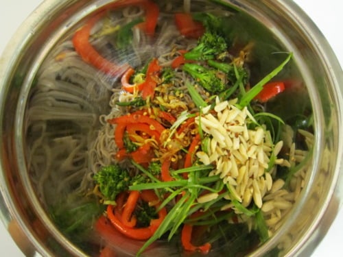 Remove vegetables from heat. Add the noodles and toss with the scallions, slivered almonds and crushed red pepper flakes, to desired spiciness.