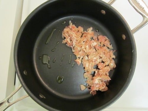 Heat the oil in a heavy medium saucepan over medium heat. Add the pancetta and saute until golden brown, about 5 minutes.