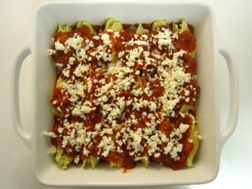 Spoon remaining sauce over the shells, then sprinkle with mozzarella.