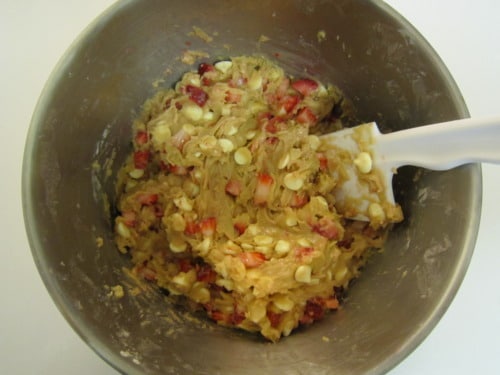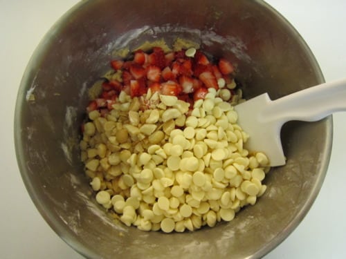 Gently stir in strawberries, macadamia nuts and white chocolate chips.