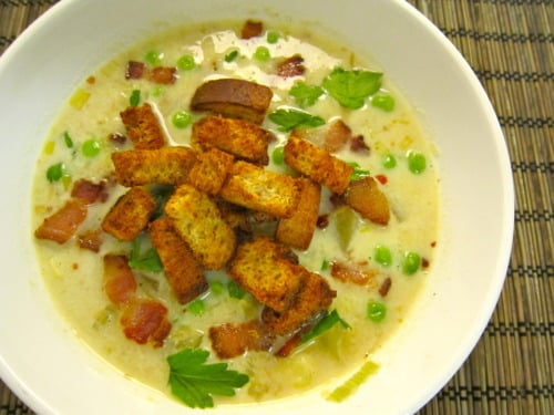 I *did* make a couple of modifications because of poor planning combined with a random winter CSA box. I doubled the recipe (as someone else suggested). I didn’t have any bacon or frozen peas on hand, but I did have a kielbasa, and I also had some frozen broccoli. ALSO…I had a side of stale-and-already-baked garlic bread, so I just chopped it up to make instant croutons. Chungah, thanks for another gold star recipe!!