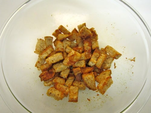 To make the croutons, melt 1 tablespoon butter, then mix with the paprika in a bowl. Add the bread cubes and toss.