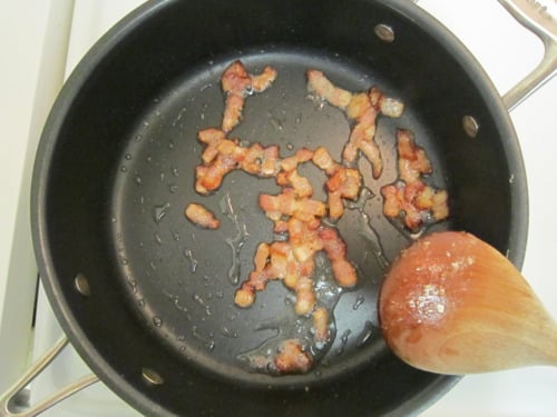 Meanwhile, cook the bacon in a large saucepan over medium heat until crisp, about 8 minutes. Transfer with a slotted spoon to a paper towel-lined plate. Discard all but about 1 tablespoon fat from the pan.