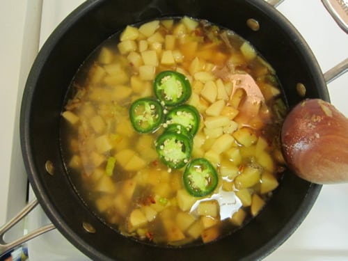 Add the broth, potatoes, jalapeno slices, and 1/4 teaspoon each salt and pepper; cover and bring to a boil over high heat. Reduce heat to medium and simmer, partially covered, until potatoes are tender, about 10 minutes.