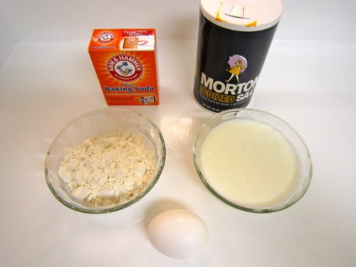 In a large bowl. whisk together the buttermilk, flour, egg, baking soda and salt. (Do not overmix because this overdevelops the gluten, resulting in rubbery pancakes.)