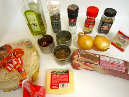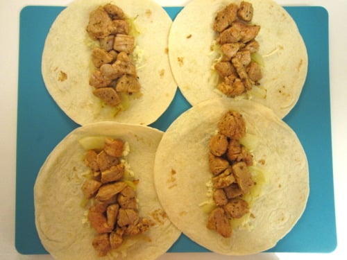 Place a bit of cheese in the center of the tortilla. Then add caramelized onions on top of the cheese, then diced pork tenderloin; roll.