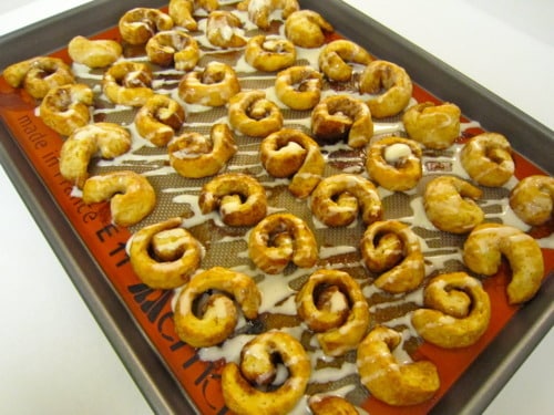 Use a sharp knife and cut 1/2-inch slices and place onto prepared baking sheet. (I cut 5 slices per biscuit making 40 small cinnamon rolls.)