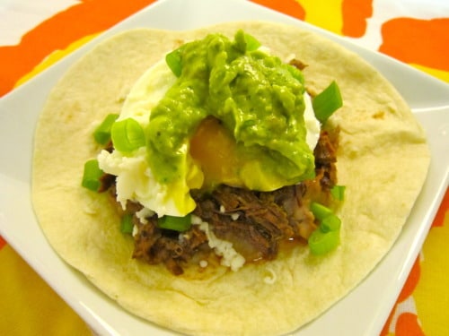 Cook tortillas in a hot pan for 45-60 seconds on each side (this will make them soft and pliable). Place the tortillas on the serving plate, spread with refried beans, add some barbacoa beef, then top with poached egg, cheese, green onions, and avocado sauce.