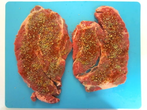 Season the chuck steak evenly with all of the spices, to taste, on both sides of the beef.