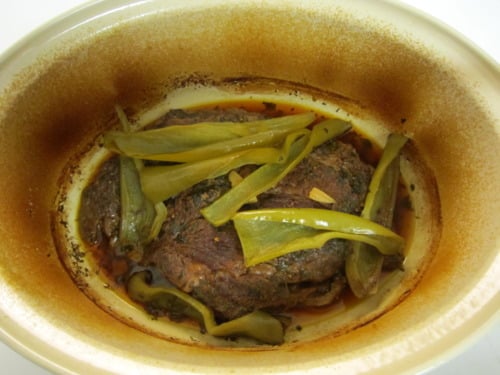 When the meat shreds easily, remove it from the oven and discard the peppers. Shred the meat and let it sit in the juices; set aside.