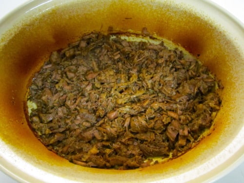 Place the lid on the Dutch oven and place in the oven. Cook for 3 hours or until the meat shreds easily. (Make sure you check every hour or so to make sure you have liquid in the pan. If it gets low, add more water).