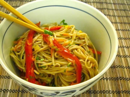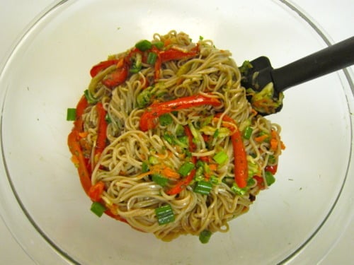 Since I loved the Soba Noodle Stir-Fry with Spicy Almond Butter Sauce, I thought I would try another soba noodle recipe. I specifically chose this recipe because it was packed with so many healthy ingredients, like bell peppers, carrots, cucumbers, and green onions. It also included cilantro, which is very beneficial to the digestive system. But what I really liked about this dish was the salad dressing. It was so wonderfully refreshing, with a spicy kick to it from the Sriracha along with that subtle tanginess from the vinegar. It was just what we needed in this 100 degree weather in Southern California.