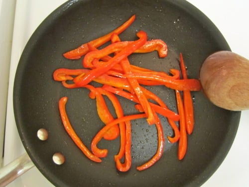 While the noodles are cooking, heat olive oil over medium-high heat in a small skillet. Add the peppers and saute until just tender, about 5-7 minutes.