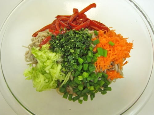 Add the noodles, carrot, pepper, cucumber, green onions and cilantro.