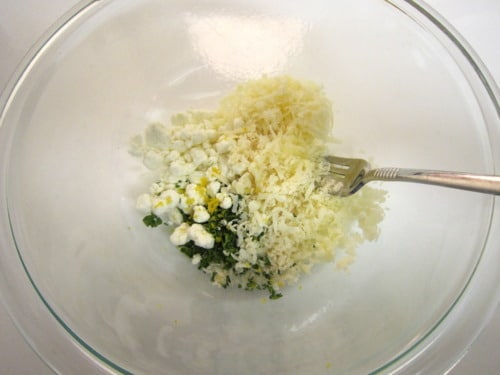 While the pasta is cooking, combine a handful of goat cheese, Gruyere, and Asiago, a pinch of lemon zest, panko, parsley and 1 tablespoon of melted butter in a small bowl.